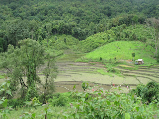After a quick shower (ice cold water dribbling out of a hand held shower head in a roofless wooden shack) we were off for another full day of hiking through the village we stayed in (right past the villages church and school. As the village children called out from their classroom and waved at us, I began to wish I had learned to say "pay attention to your teacher" in Thai. Sadly, it was nowhere to be found in Lonely Planet), more jungle, more paddies, more rain, and a lot more mud. By the time we stopped for lunch our beautiful new Keens were no longer beautiful, new, or anywhere close to their original colors. After some very good meals on day one, lunch on day two was a bit of a letdown. We had plain rice noodles in lightly cabbaged ho water prepared specially for us. Though that is a lot less insulting than every one else's food, which was a large supply of freshly prepared Thai ramen noodle packets. Though I think they were glad to not be eating Dan's squirrel stew. Then we slipped back into our blocks of mud and hiked some more until we arrived at our waterfall camp. I think the hiking on day two was the best. Adina and I fell back a bit with Aneirin, which was actually really nice because once the group turned a bend in front of us all we had was the peaceful quiet of the jungle. The greens of the jungle get extra deep after the rain, which totally makes up for the rocky path getting more slippery. That was fall number two. Not as muddy, but I did come out of it with a nice gash on my arm. This time around the waterfall provided a much needed cool down, and a chance to clean up a bit, too. Though I didn't bring a shampoo bottle to lather up before doing backflips off the rocks like Eddy did, I was going to borrow his soap for a bit. That is until he stuck it down his pants and 'cleaned' for a while. I decided I could wait.